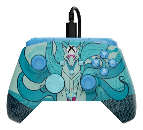 Ready for a rematch? Take your gaming setup to the next level with the Rematch Advanced Wired Gaming Controller for Xbox and PC. The Blue Kitsune controller is inspired by the legendary fox of Japanese Folklore, known for its intelligence, speed, and shape-shifting power. This design features stunning fox imagery in soft blue tones, creating a sense of movement and energy that flows across the surface. It brings a calm yet powerful aesthetic to your setup and turns your controller into a striking expression of style and character.Bringing its bold design to life with a powered glow, this controller lights up instantly when connected to your Xbox or PC. The vibrant blue lighting adds atmosphere to your space, illuminates the design, and keeps the magic alive through late-night sessions.