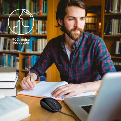 - The sound of silence: The M110 Logitech mouse offers the same click feel with more than 90% noise reduction on the click sound. Enjoy a quiet experience for you and those close by