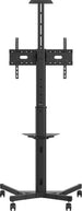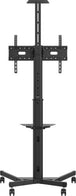 The cart includes one shelf for a video conference camera above the display and a larger one below for laptops and other equipment. Both shelves are height adjustable.