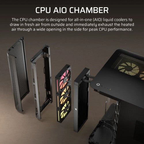 A unique triple-chamber design was created to isolate hot components for effective cooling and maximum performance at all times. Separate chambers for the CPU, GPU/motherboard, and PSU, cables, and storage allow for exceptional thermals and an easy PC building process.