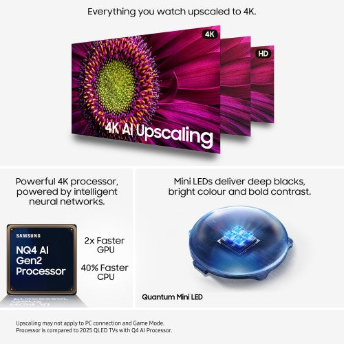 | Brand-specific features | NQ4 AI Gen2 Processor, 4K AI Upscaling, Quantum Matrix Technology Core, Neo Quantum HDR, Dolby Atmos® (virtual), Motion Xcelerator 144Hz, PANTONE Validated, AI Sound Pro, Smart TV powered by Tizen OS*, Gaming Hub, Samsung TV Plus, Samsung Q-Symphony, Object Tracking Sound Lite, Samsung Knox Security, SmartThings, Colour Booster Pro, Real Depth Enchancer, Auto HDR Remastering, Supersize Picture Enhancer, AI Auto Game Mode, Game Bar, AI Mode, AI Customisation Mode, SolarCell Remote, FreeSync Premium Pro, Universal Gesture, Generative Wallpaper, SmartThings Collaboration, Auto Game Mode (ALLM), AI Energy Mode, Multi View, Multiple Voice Assistants, Samsung Health* |