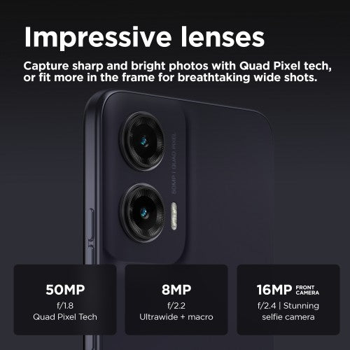 Big screen. Breathtaking moments.Life’s biggest moments deserve a big stage. Meet moto g35 5G. With a huge 6.72’’ FHD+ display, your films, games and video calls come to life even in bright light with 1,000 nits of peak brightness. All backed by multidimensional Dolby Atmos® sound on stereo speakers or your favourite pair of headphones. Take breathtaking shots using the ultra-wide lens or capture sharp and bright photos in any light using the 50 MP camera with Quad Pixel technology. Enjoy a stunning, ultra-thin premium design, including an option with the luxurious feel of vegan leather. Unleash super-fast 5G performance with an octa-core processor – plus get 4 GB of RAM and up to 256 GB of storage.(2,4) And make sure the fun never stops thanks to a long-lasting battery. moto g35 5G is made for big moments.