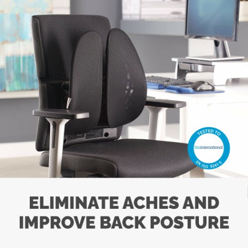 A few easy adjustments to your workstation can make a huge difference to your daily routine. At all times you should avoid straining your back muscles and putting your body at risk. With this Fellowes back rest for office chair, you can make sure that you are retaining the correct posture as it provides additional spinal support to maintain natural back curvature and the innovative design moulds to your body's contours. Eliminating the need for re-adjustment, the tri-tensioning attachment holds the office chair back support in place for a comfortable working environment. It's ergonomic design incorporates two wings which move independently to mould to your back with vents to promote airflow. Sitting in a chair without proper support can cause back discomfort, poor circulation, overall fatigue and long term issues which is why a using a Fellowes back support for office chairs is a necessity in any office or home environment in order to maintain your posture and improve overall comfort. This back rest for office chair can easily attach to any chair and is accredited against FIRA - an ergonomic accreditor for Fellowes.Specifications