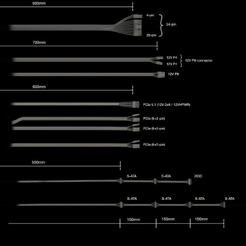 Power Zone 2 750W is an ATX 3.1 PSU and comes with both native integration of the 12V-2x6 connector for next-generation PCIe 5.1 graphics cards, and 3 PCIe 6+2-pin connectors for support of current-gen GPUs. A 90° angled 12V-2x6 connector in the scope of delivery leaves no doubt that this PSU is here to stay. All of this makes Power Zone 2 750W extremely versatile and the perfect choice for powerful systems of today and the ones to come.
