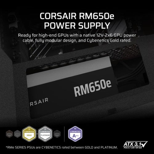 Corsair 650W RMe Series RM650e PSU | Fully Modular | Low-Noise | Cybenetics Gold | Zero RPM Mode | ATX 3.1 | PCIe 5.1