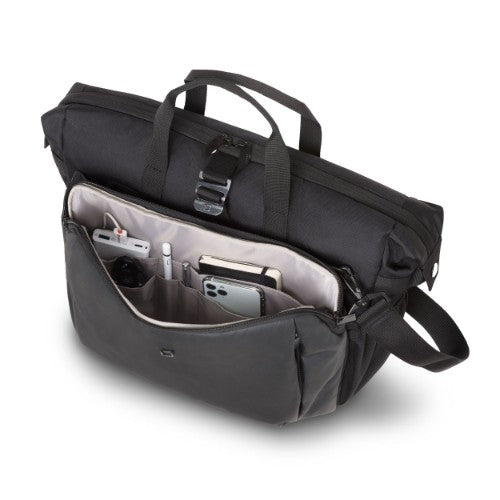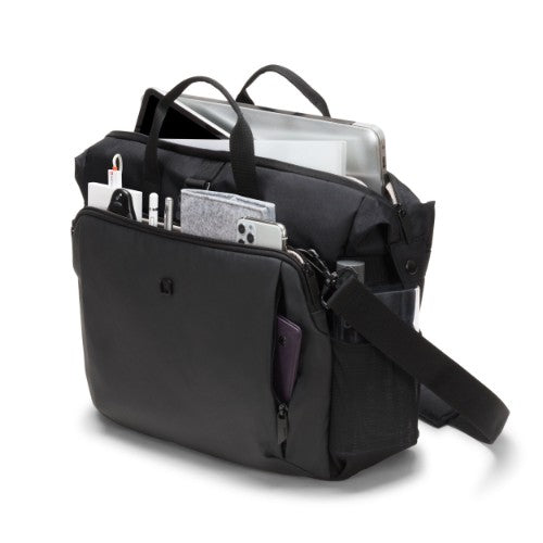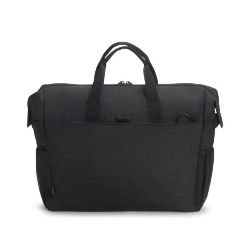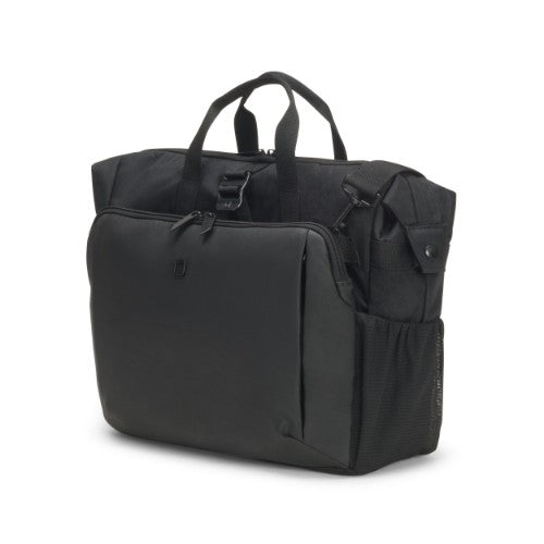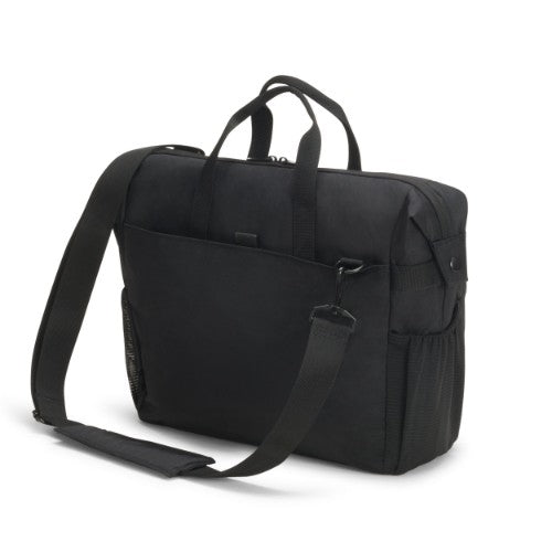 Today's actions shape tomorrow's world. Which is why, here at DICOTA, we are dedicated to developing environmentally friendly solutions and therefore make all the items in our ECO collections out of sustainable, recycled PET. We reuse up to 31 PET bottles, so you will receive an environmentally friendly product with a life-long guarantee. Our PET products also have the quality, look and finish that you know and love.The Eco Top Traveller GO offers ideal protection for laptops. The fitall system separating wall in the notebook compartment lies protectively across your notebook and fits automatically to sizes from 13 to 15.6". The slip pocket provides reliable protection for tablets up to 12.9". The spacious main section is divided so that documents and accessories can be stored separately. Open expandable compartment for active gear such as sport shoes, helmet, yoga mat, etc. including elastic mesh side pockets and metal hook for fixation. The front pocket has practical compartments so you can organise mobile accessories like smartphone, pens or chargers. There is a document compartment at the back for easy storage of documents. Carry the bag comfortably with the handles or use the adjustable, padded shoulder strap. The bag is made of water-repellent material to protect the contents even on rainy days. The Eco Top Traveller GO is therefore perfect for you if you are always on the go and want to support the recycling of PET bottles with an eco-friendly bag.
