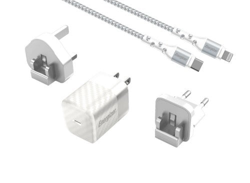 Energizer® Power Delivery Chargers will follow you around the world with 3 power outlet plugs included: