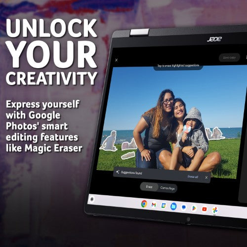 Inspire your inner creator with the built-in Google Photos app on your Chromebook Plus. Get enhanced features like the AI-powered Magic Eraser that easily removes unwanted distractions and an HDR effect to enhance brightness and contrast.