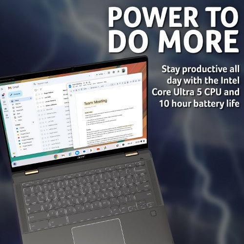 With up to 10 hours of battery life1,5 you can power through a day’s work and then some, on the 2x faster Chromebook Plus2 powered by the latest Intel® Core™ Ultra processors1.