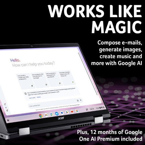 Powered by the latest Intel® Core™ Ultra Processors1–the Acer Chromebook Plus Spin 714 is the embodiment of power and portability. A premium thin and light 2-in-1 convertible Chromebook for on-the-go study, work, or play.Your Style, Your Way