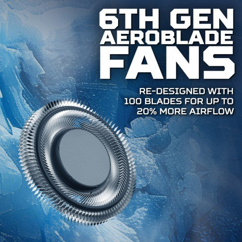 Engineered for maximum cooling, the 6th Gen AeroBlade™ 3D Fan features ultra-thin, responsive metal blades that rise and adapt at high speeds, increasing airflow efficiency by 20%!