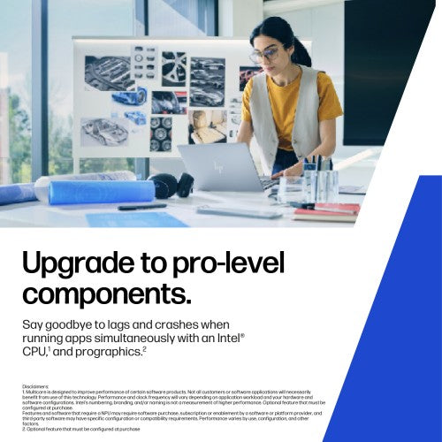 Say goodbye to lags and crashes with fast responsiveness. With an Intel® Core™ Ultra CPU,[2] with up to 13 NPU TOPS,[2] integrated or discrete graphics,[3] and large memory configurations,[3] open large files and run pro apps simultaneously for speedy multitasking.Work all day. Anywhere.