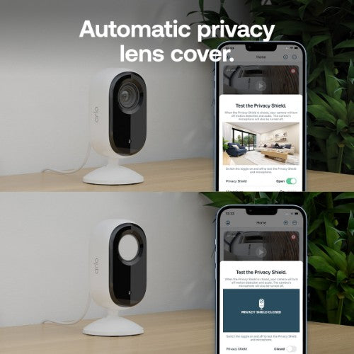 The indoor security camera that protects your home and your privacy. When disarmed, the automatic lens cover closes fully, so your camera only sees when you want it to. When armed, it captures clear 2K video, even in low light, and sends real-time alerts straight to your phone. With Arlo Secure (sold separately), smart AI detection recognises people, pets, sound and even fire, so you only get alerts that matter. Speak to family or warn off intruders using two-way audio, or trigger the built-in siren for immediate deterrence. Use the Arlo app to customise activity zones – an Arlo Secure feature - and block out private areas with privacy zones. Set up in minutes and unlock even more protection with Arlo Secure (sold separately).Automatic Privacy Lens Cover.