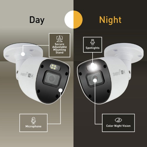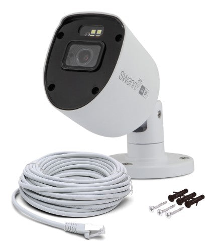 Secure your home with the Swann AdvancedX™ 5MP NVR system. Pair this add-on camera with you AdvancedX Security System to capture critical details like faces and license plates, even in complete darkness with color night vision and powerful spotlights in 5MP. Wired PoE ensures reliable 24/7 monitoring. Advanced motion detection and video analytics provide instant alerts for people, vehicles, and intrusions, while spotlights deter unwanted activity. Capture complete event recordings with pre- and post-event footage. Access live video and recordings via the Swann Security app or on your TV via HDMI cable. Protect your home with the clarity and reliability of Swann AdvancedX™.Specifications