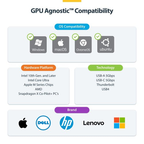 DisplayLink-based HDMI and DisplayPort outputs enable multi-monitor setups on macOS, Windows, and ChromeOS. The USB-C video output port leverages the laptop's built-in GPU to deliver high-performance video output. A unified driver experience simplifies hot desk provisioning, reduces IT support overhead, and ensures consistent performance across transient and mobile workstations.