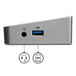 To support all of your USB peripherals, the docking station provides five USB 3.0 ports. The side-facing USB port is a USB fast-charge port (USB Battery Charging Specification 1.2), so you can charge your mobile devices faster than from standard USB ports, with or without your laptop connected to the dock. The dock also has a GbE port, headset jack and separate 3.5 mm audio and mic ports, so you’ll have all the connections you need to stay productive.
