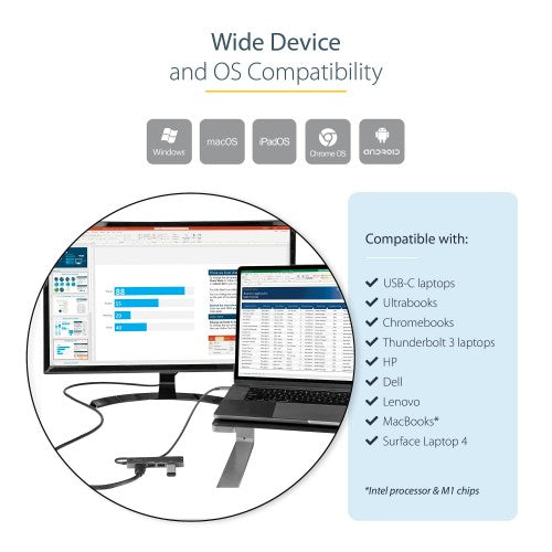 - WIDE COMPATIBILITY: Compatible with USB-C laptops, ultrabooks & Chromebooks, plus Thunderbolt 3 laptops from HP, Dell, Lenovo, MacBooks (Intel processor & M1 chip), and Surface Laptop 4; USBC mini dock works w/ Windows, macOS, iPadOS, Android & ChromeOS