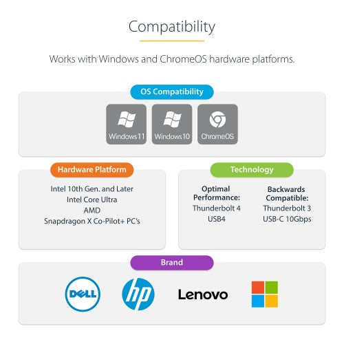 - COMPATIBILITY: Dock is Compatible with Windows 11 (x64 and ARM), Windows 10, and ChromeOS; Optimal performance with Thunderbolt 4 and USB4 laptops; Compatible with Intel 12th Gen and later, Intel Core Ultra, AMD, and Snapdragon X Co-Pilot+ PC's