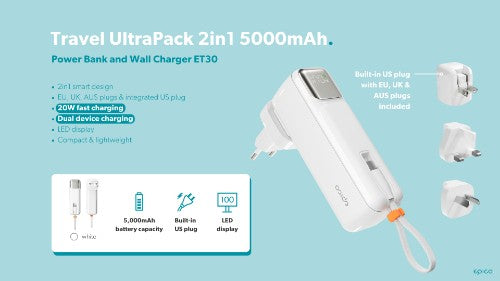 This power bank stands out with its smart 2-in-1 design – use it as a portable charger or plug it directly into a wall socket for instant charging. It comes with interchangeable plugs for the EU, UK and AU, plus a built-in US plug, making it the perfect charging partner for international travel. A handy LED display shows the remaining battery at a glance.