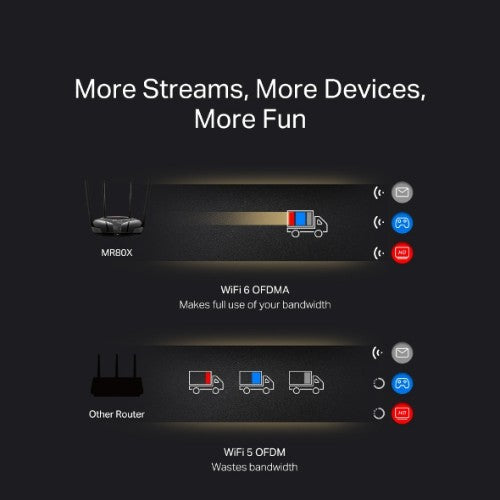 Streaming or gaming on multiple devices brings more fun without dragging down performance. MR80X supports OFDMA and MU-MIMO1 to power up your WiFi by allowing multiple clients to transmit at the same time. This delivers 4× greater network capacity and efficiency in traffic-dense environments.