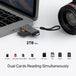 With two card slots, you can easily transfer data form SD and microSD cards simultaneously, or from one card to the other. The UA430D is compatible with UHS-I cards, making it easy to quickly move large files from cards with a super fast data reading speed up to 200MB/s.