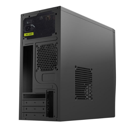 - Black chassis with 80mm rear cooling fan included