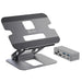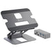 This multi-angle stand is made of durable aluminum and can support a variety of items in addition to a laptop including tablets, books, etc. Its foldable design allows for easy storage or transport, while the viewing angles and heights can be adjusted to fit your needs and optimize your viewing experience. This versatile stand gives you the ability to create a more efficient workspace, whether you need extra space or a standing desk setup.The integrated USB-C® mini dock lets you easily create a workstation with one 4K HDMI™ or Dual 1080p HDMI™ display outputs, a Gigabit Ethernet port for easy network access, and two USB™ 5Gbps Type-A downstream ports, as well as a USB-C® port that supports 5Gbps data transfer rate and up to 100W pass-through, providing all the connectivity you need for enhanced productivity and to connect your peripherals.